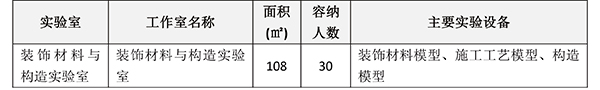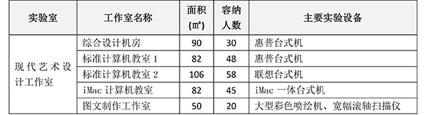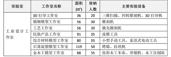 通过近年来的不断建设与发展,建立起了目前在国内高等艺术院校中比较先进,在自治区处于示范领先水平的图形设计工作室、材料研究工作室、石膏与泥塑模型工作室、金木工模型工作室、综合材料模型工作室、精细模型工作室、民族工艺品材料工艺制作研究室(在建)、工业产品设计工作室(在建)等重要的教学实验与设计研究场所,为本专业的教学实践与设计研究提供了可靠的物质条件和平台建设保障。现有实验场地500多平米,拥有三维扫描仪、三维熔融挤压快速成形机、进口激光雕刻机等先进设备。现有实验室主任1名,专职实验人员1名。