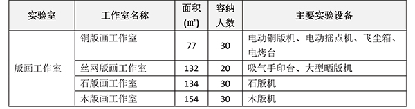 版画专业于1984年先后增设了包括丝版画、铜版画、综合版画等版种在内的实验教学,实验教学体系和实验教学管理体系初步形成。版画工作室于2003年10月正式成立并纳入实验室管理制度,先后建成铜版工作室、丝网工作室、木版工作室、石版工作室。现有实验场地620平米,拥有国内外版画制作的主流设备,是目前区内最先进的专业工作室之一。从建立到现在为我区乃至全国培养了大批优秀的版画专业人才。工作室现有实验室主任1名,专职实验人员1人。版画工作室的建设与发展为自治区各高校在美术和艺术设计教育领域的实验室建设与管理、实践教学和成果形成起到了积极的示范作用和指导意义。