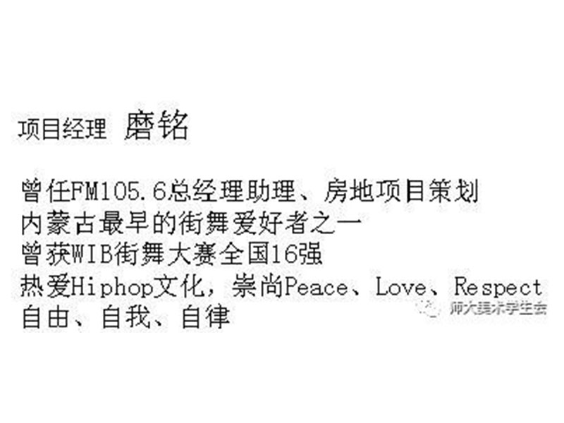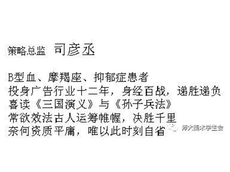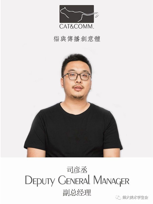 司彦丞老师为猫和公司的策略总监,投身广告行业十二年,经验丰富。美术指导张宝和老师,曾担任德国triumph集团,中国雅芳广告部经理,负责华北区形象统筹把握,曾在北京举办个人画展。为了帮助老员工更好的认识创新创业,老师们将以自身的经历与大家进行思想交流。同为美术指导的刘少泽老师为一名资深设计师,在汽车、餐饮领域颇具建树,作品连续多年入选《中国老员工美术作品年鉴》。项目经理磨铭老师,曾担任FM105.6总经理助理,房地产项目策划。