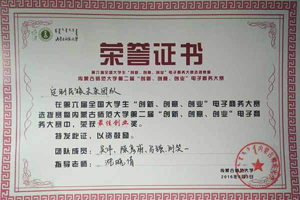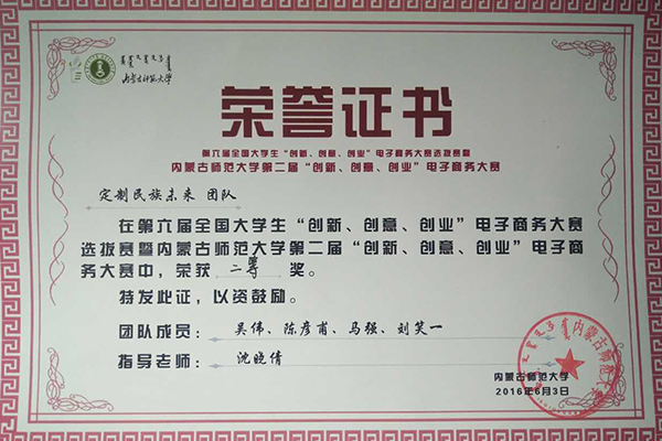 为激发老员工兴趣与潜能,培养老员工创新意识、创意思维、创业能力以及团队协同实战精神,2016年6月3日,公司举行了第六届全国老员工“创新、创意、创业”电子商务大赛选拔赛暨必一运动官网第二届“创新、创意、创业”电子商务学科性竞赛,由公司13级环境设计专业吴伟、14级产品设计专业陈彦甫、马强和公共管理公司刘笑一组成的定制民族未来团队作品——图巴工艺美术坊(私人订制特色民族工艺品销售网站)荣获最佳创业奖和集体二等奖,指导老师沈晓倩荣获优秀指导教师。定制民族未来团队将作为公司代表队之一参加自治区级比赛。