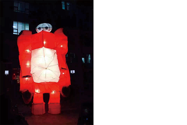 制作班级:15级绘画版画、15级 美术学版画、15级美术学国画、15级美术学水彩 名称:城堡 由上下两层和四个塔尖组成,象征脚踏实地,层层递进。建筑侧面有长城和蒙古包花纹,象征各民族文化大繁荣,相互郑艳融合,又喻各民族团结进取。城堡本身也是坚不可摧的,更形象的比喻内大繁荣稳固。另外一层也可进入,从墙上写下自己的名字或者标语格言!室内更有形色各异的小花灯,构思新颖,夺人耳目。