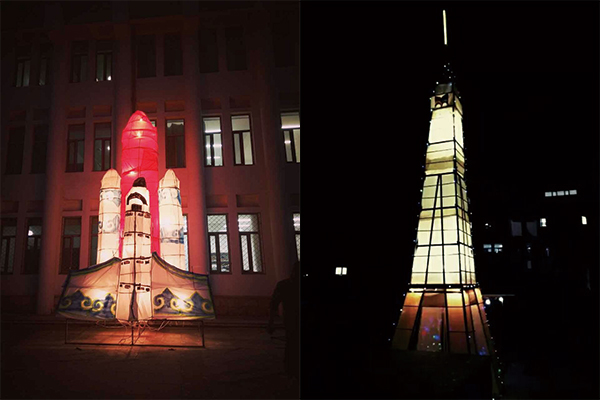 制作班级:15级工业班 名称:腾飞 花灯名为"腾飞",寓意着美院蒸蒸日上节节攀升,花灯上附有蒙古特有的纹路象征着内蒙特有的民族特色。高大的火箭与飞机彰显出工业班的气势,同时也标志着当代员工火的气势与向上的意志。让花灯点亮我们美好的生活,愿工业班越来越好!