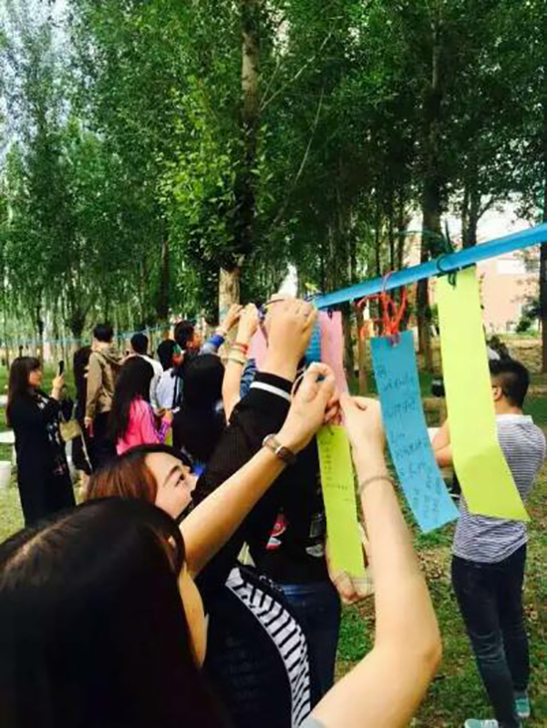 欢送会伊始,必一运动学工办主任沈晓倩老师致辞,她深情倡议同学们把对母校的不舍,对员工时代的回忆、师生情、同学情或者是自己的美好愿望写在留言签上悬挂在美院大楼东的毕业林中,一同纪念美好的老员工活。