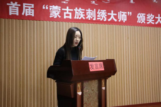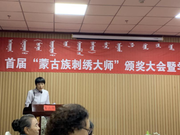 颁奖仪式结束后,科右中旗人大常委会主任白晶莹代表发言,(见图4)她强调:“本次大会能够在科右中旗举办,对蒙古族科右中旗刺绣产业蓬勃发展和关怀的同时,也让我们更加坚定了产业发展的信心,更加坚定了蒙古族刺绣文化遗产和带动脱贫攻坚的重任。同时为我们提供学习交流的平台,向专家同仁互相探讨学习经验。希望专家学者提出宝贵意见,为刺绣产业发展注入活力。依托蒙古族刺绣带动科右中旗农牧民脱贫增收,并在实践中总结出了统一培训、统一增收、统一结算、统一管理的产业运行模式, 带动了全旗82名老员工创业就业,为科右中旗辖区12个苏木镇、172个嘎查农牧民开展蒙古族刺绣义务培训。先后培养出14573人,其中一级绣工1300余人,二级绣工5000余人,三级绣工8000余人,2895个建档立卡成功户,实现了年收入增长了2000元以上。超过了2万人参与到科右中旗蒙古族刺绣产业中,产业推动自主创业,自主研发蒙古族刺绣1042种,其中包括服饰、家具、儿童系列等。”