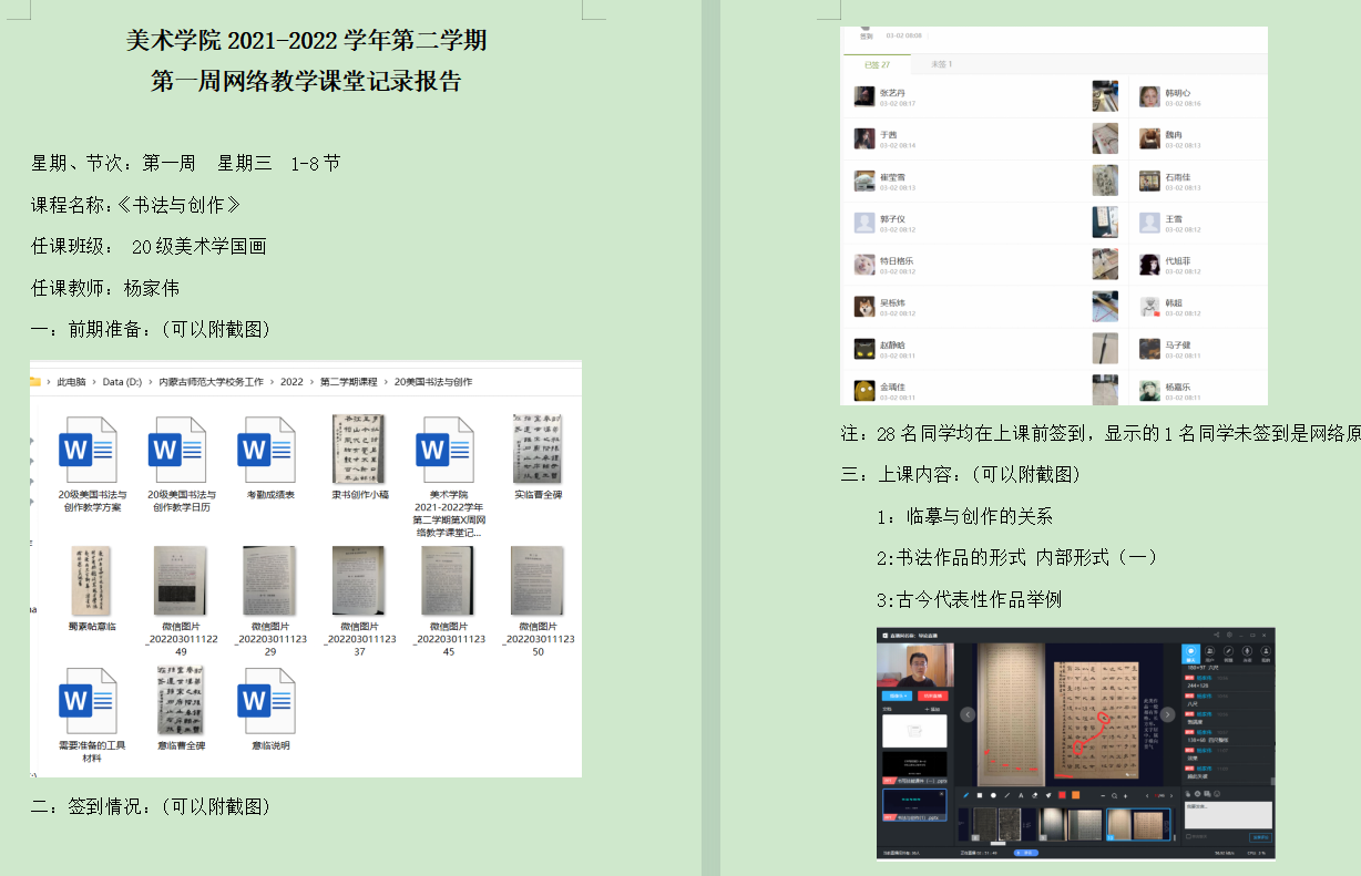 1、本周公司共开设线上课程65门次,涉及65个教学班,有41名教师完成线上教学任务,教师按时到岗率100%,应上课员工1943人次,实际到课员工1943人次,员工到课率100%。