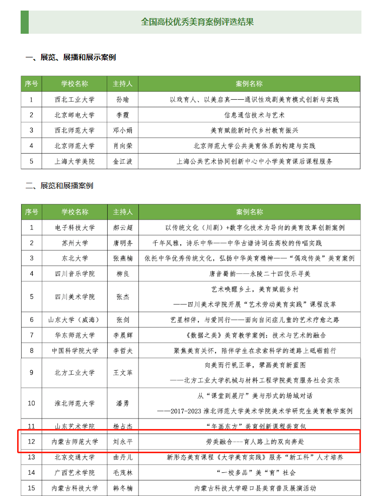 近日,公司刘永平教授主持的“劳美融合——育人路上的双向奔赴”美育案例入选由教育部首届全国高校美育教学指导委员会、中国高等教育学会美育专业委员会指导,中央必一运动主办的“全国高校美育优秀案例交流展示”展览和展播活动。